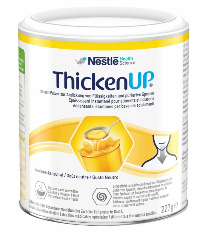 Geschmackneutrales Instant-Pulver zur Eindickung von Flüssigkeiten und pürierten Speisen. Erhältlich in allen Apotheken und Drogerien, in der Dose à 227g.